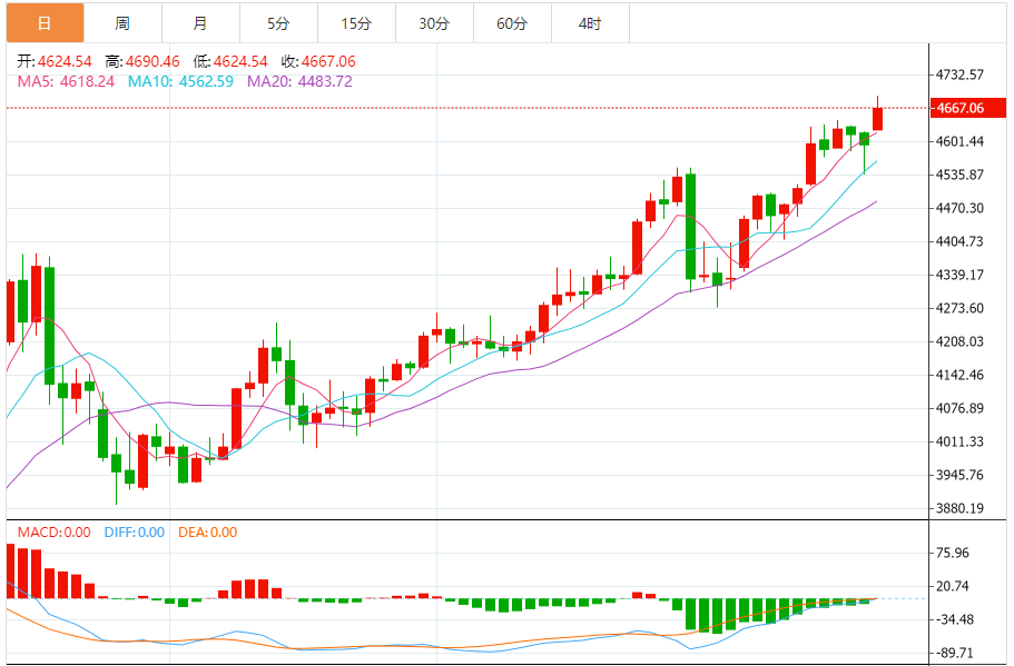 周一(1月19日),现货黄金目前位于4666.44美元/盎司附近,涨幅为1.54%。