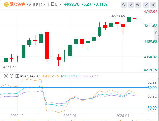 周一,受助于避险需求,现货金银周一双双创下纪录新高,国际现货黄金一度触及4690美元,截至目前,黄金报价4659.70。