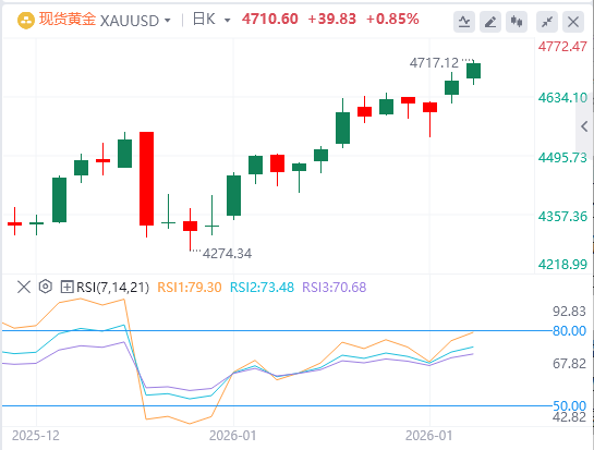 从3845.01美元起的上升通道构成了提前付款。移动平均收敛背离线(MACD)线位于信号线之上,且两者均高于零,强化了多头倾向。愈宽的正直方图表明买方仍保有控制权。RSI在70.95被超买,动能似乎被拉长。阻力位与通道上线相符,约在4709.61美元附近。