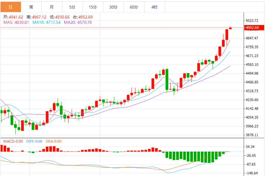 日线级别:延续四连阳强势格局,均线系统维持标准多头排列,5、10、20日均线同步向上发散,5日均线支撑位上移至4880美元,为中期趋势提供坚实依托。K线收出带上下影线的小阴星,反映4960-4980美元区间抛压显现,且金价与均线偏离度逐步扩大,存在技术性回调需求,但整体上行趋势未被破坏,站稳4900美元后上行空间进一步打开。