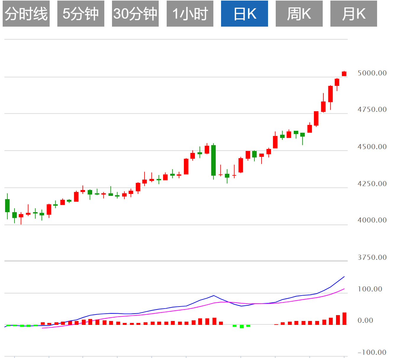 移动平均趋同/背离(MACD)线位于信号线之上且高于零,正向直方图正在扩展,表明看涨动能在增强。 相对强度指标(RSI)为80.76,表明已被拉升过度,可能会在此之前暂停。 如果动能降温,支撑位与通道底部在4932.75美元附近。 守住该底部将保留看涨结构,而决定性下破将发出更深的修正阶段的信号。