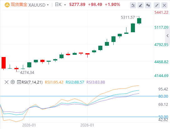 从4696.64美元起的上升通道支撑上升趋势,阻力位接近5274.38美元。移动平均收敛背离线(MACD)线位于信号线之上,两者均高于零,反映多头动能增强。直方图开始收缩,暗示动能可能冷却至阻力位。RSI位于77(超买)警告,上方可能在通道顶部附近受限。
