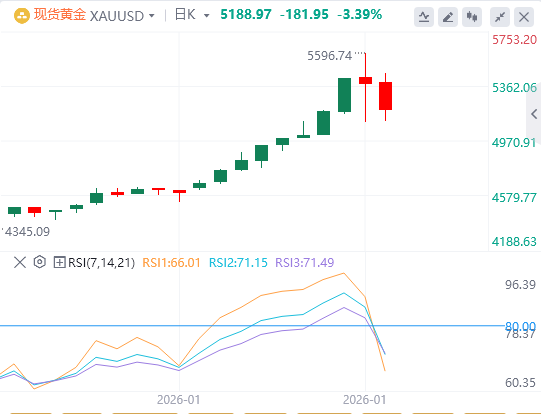 现货黄金日内振幅近500美元。其在亚盘再度逼近5600美元,但仍未能站上此处,并在美盘急转直下,较高位一度大跌400美元,但随后又上演V字行情,收复超200美元失地,截至目前,黄金报价5188。