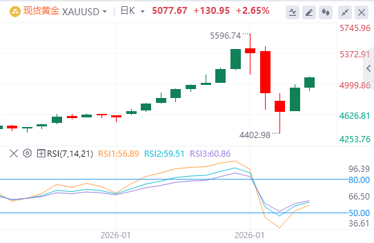若日内突破近期5600美元附近急跌的50%回撤位,即历史高点,可能成为看涨交易者的新一波触发点。若有50期简单移动平均线(SMA)之后的后续买入将验证积极前景,使黄金价格进一步升值。移动平均收敛背离线(MACD)位于信号线之上,处于正区间,正直方图扩大,显示多头动能增强。相对强弱指数(RSI)显示55.83(中性),并略高,显示出改善趋势。