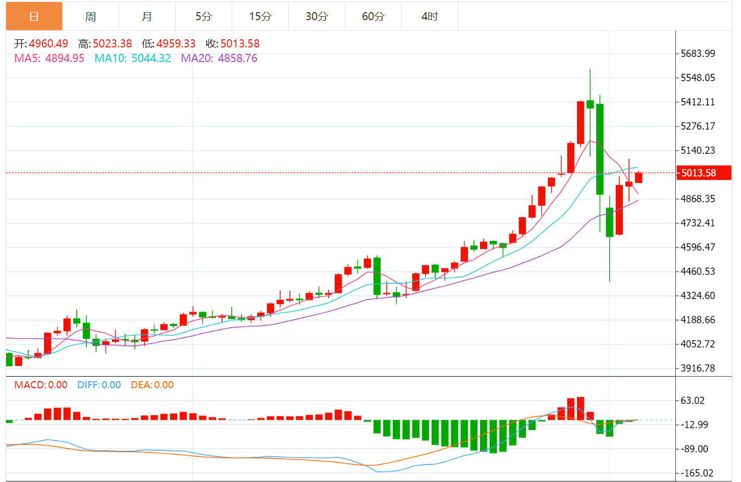 从技术指标来看,MACD显示DIFF为157.90、DEA为169.17、MACD值为-22.53,说明虽然动能有所修复,但仍处于回落后的再平衡阶段,并未形成明确的多头信号。RSI为59.14,处于中性偏强区间,表明短期仍有上涨空间,但距离强势趋势尚有差距。上方关键阻力仍在5500区域,若无法有效突破,行情很可能再次转为宽幅震荡。