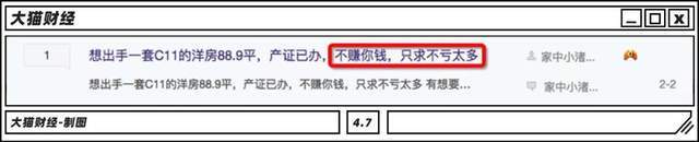 而等着升值的业主,早就放弃了能够升值的想法,不少人卖房都是按原合同开价了,而更想出手的,打出来的口号是“不赚你钱,只求不亏太多”。