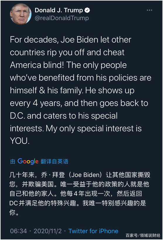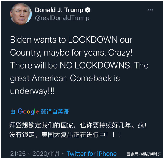 2.特朗普强调,拜登将对经济产生可怕的影响。特朗普称,“拜登想封锁我们的国家”,(封锁)可能持续好几年”,这很疯狂,“没有封锁,美国复苏进行中。”