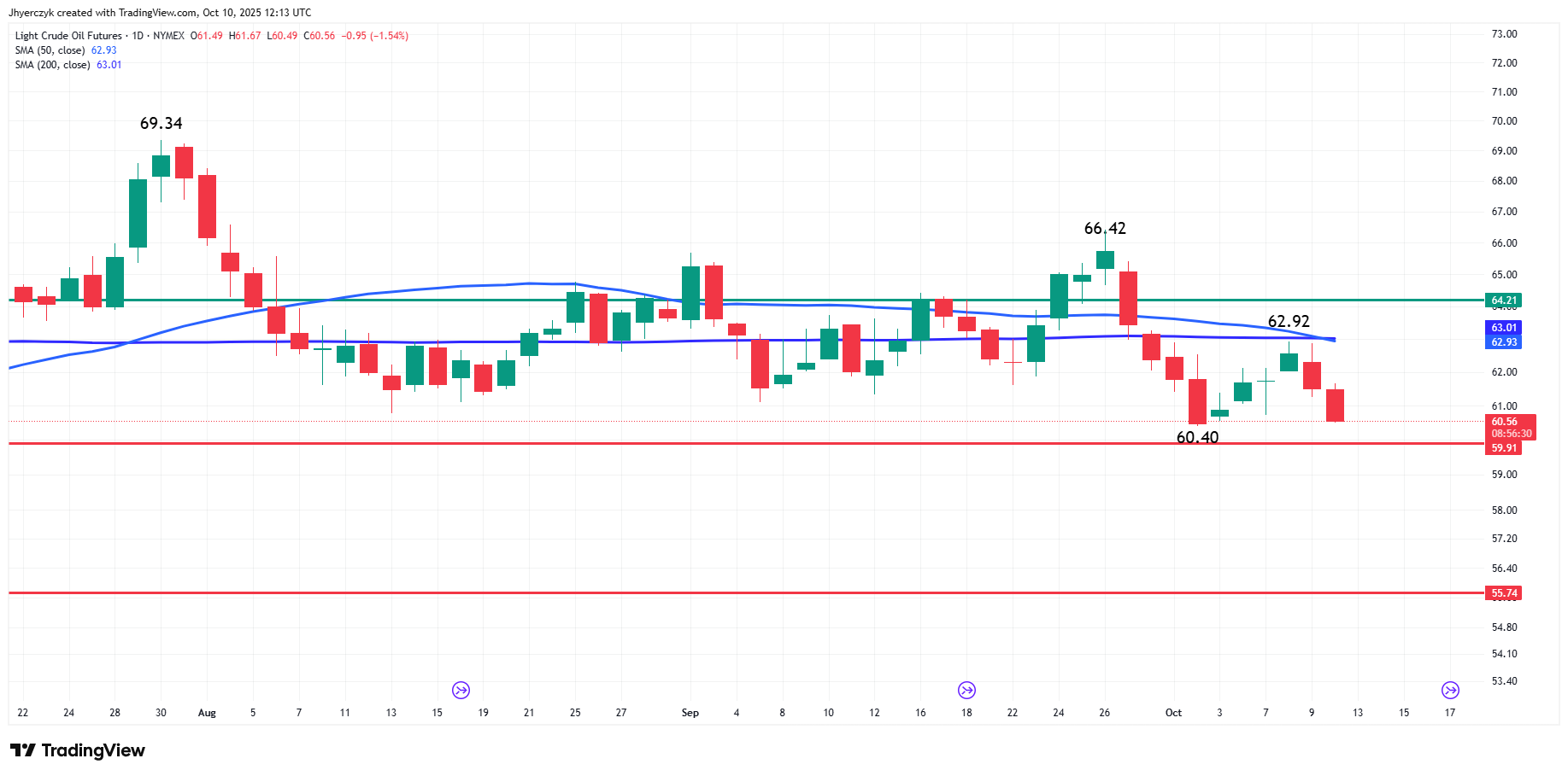 确认跌破60.40美元将为进一步下跌至59.91美元和可能的55.74美元打开大门。交易员应关注任何额外的看跌催化剂,特别是来自欧佩克供应调整或美国经济状况疲软。