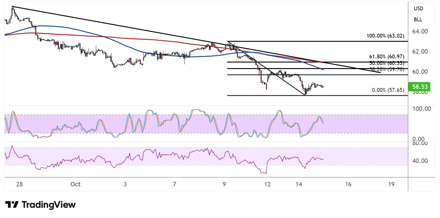 然而,价格似乎正在58.53美元附近盘整,因此在抛售恢复之前可能会出现回调。斐波那契回撤工具显示阻力位可能吸引更多卖家加入下降趋势的位置。
