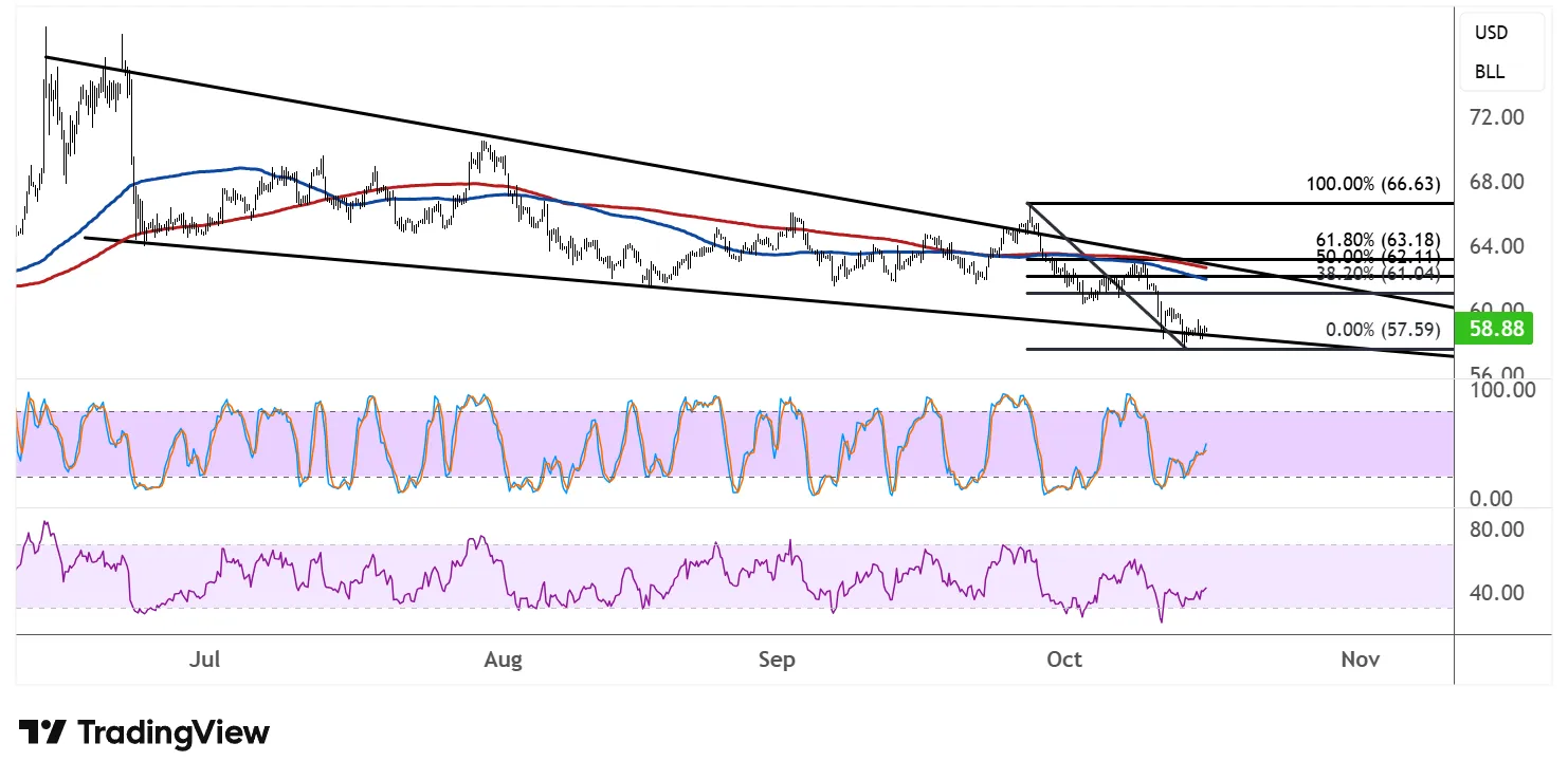 WTI原油在短期时间范围内一直在下降楔形形态内盘整,目前价格约为每桶58.88美元。这种图表的形成通常表明看跌势头减弱,并且有可能出现上行突破。