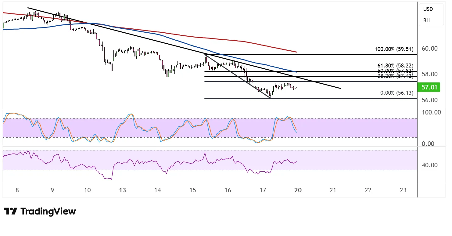 斐波那契回撤工具显示卖家可能在哪里等待重新入场。38.2%斐波那契为57.42美元,而50%水平为57.82美元。更大的修正可能会达到61.8%斐波那契58.22美元,该线与短期下降趋势线紧密对齐,可能是看跌回调的沙线。