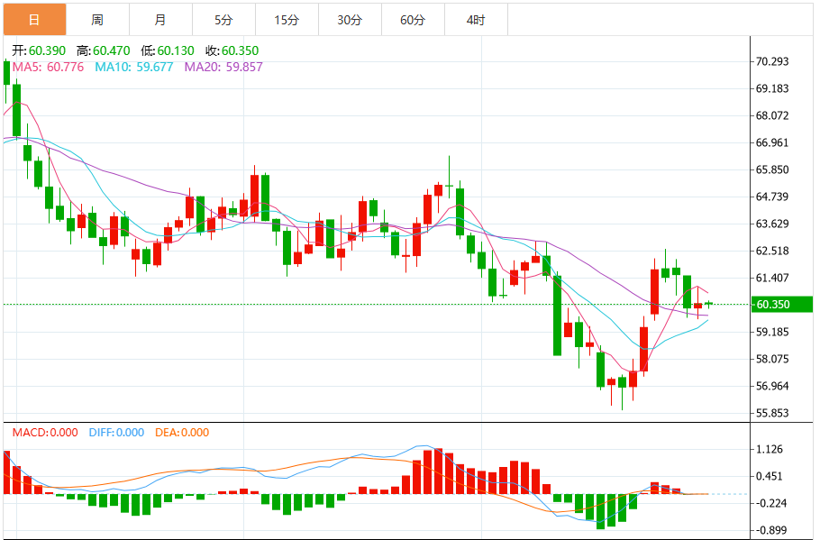 上方阻力位在61.80美元,若突破该区间,下一目标将指向63.50美元;下方支撑位位于59.80美元附近,若跌破该位,则可能重新测试58美元低点。整体结构显示,油价短线或维持温和反弹,但中期走势仍偏震荡。