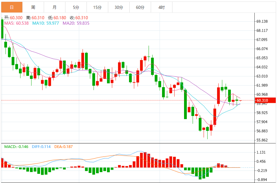 油价周四小幅上涨。中美领导人在韩国会晤之后,投资者评估中美贸易争端潜在休战可能性。纽约商品交易所西得州中质原油(WTI)主力合约上涨0.09美元,涨幅为0.15%,收于每桶60.57美元。布伦特原油合约结算价上涨0.08美元,涨幅为0.12%,收于每桶65.00美元。