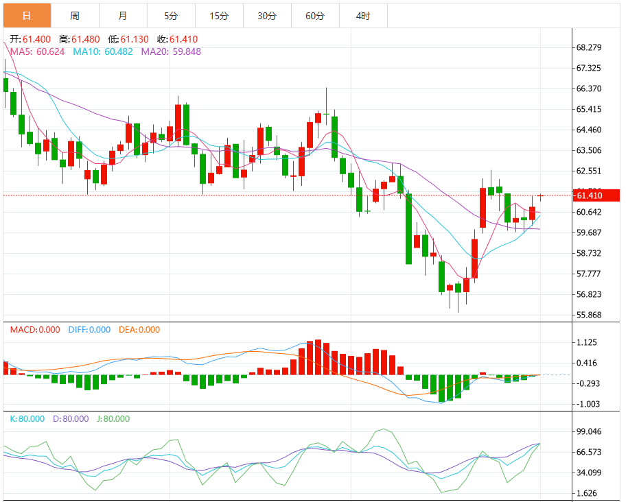 从技术面观察,WTI原油日线图显示,价格在过去三个月呈现矩形震荡格局,区间约在57至63美元之间。短期均线(9日EMA)已向上穿越中期均线(21日EMA),显示短线买盘增强。