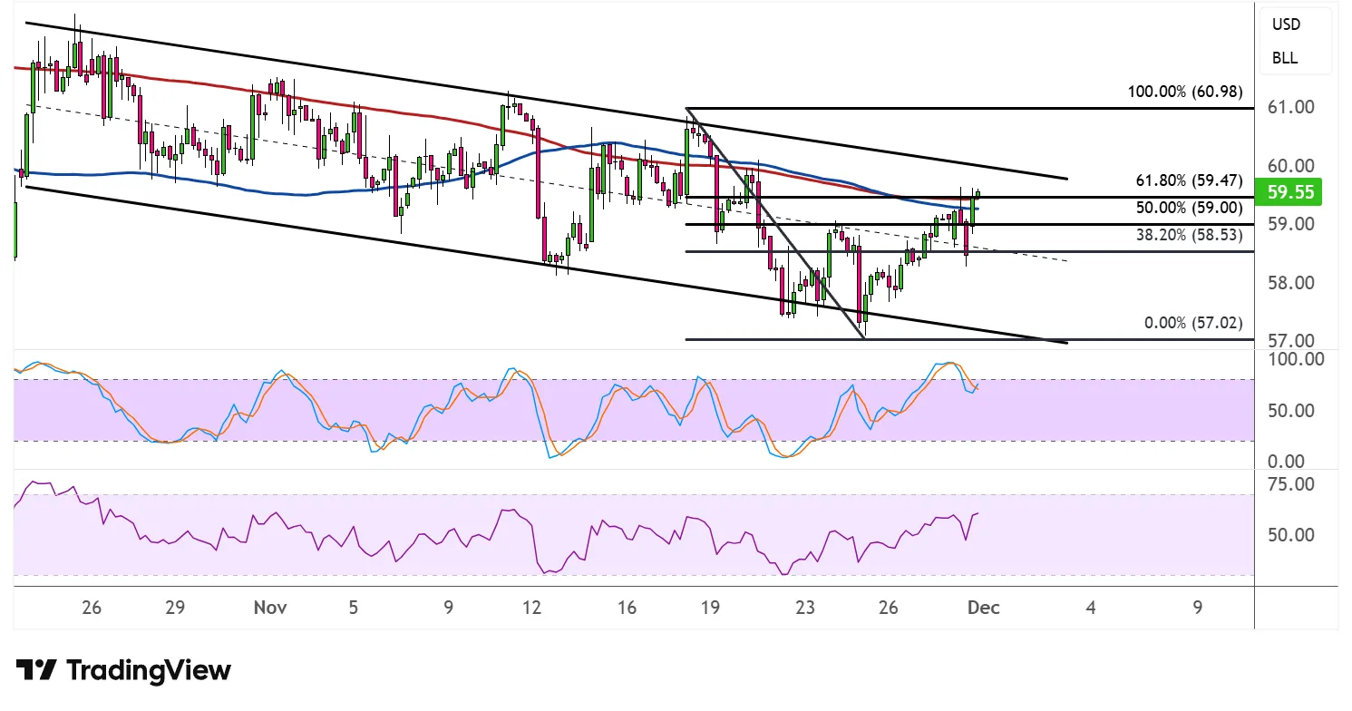 该商品目前交易价格接近59.55美元,可能反弹试探破损通道底部作为阻力。该区域与关键的斐波那契回撤位相吻合,可能引发新的抛售压力。