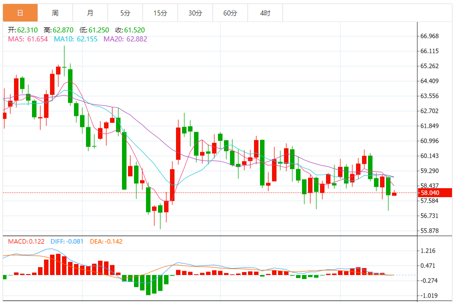 从实时技术形态看,原油短期处于多空平衡状态。WTI原油日线级别呈现“阴阳交错”格局,5、10、20日均线形成空头排列,但MACD指标绿色动能持续收缩,显示下行动能边际减弱;4小时图上,价格在58.5-59.2美元区间震荡整理,布林带收口,RSI指标回升至45中性区间,缺乏明确趋势信号。