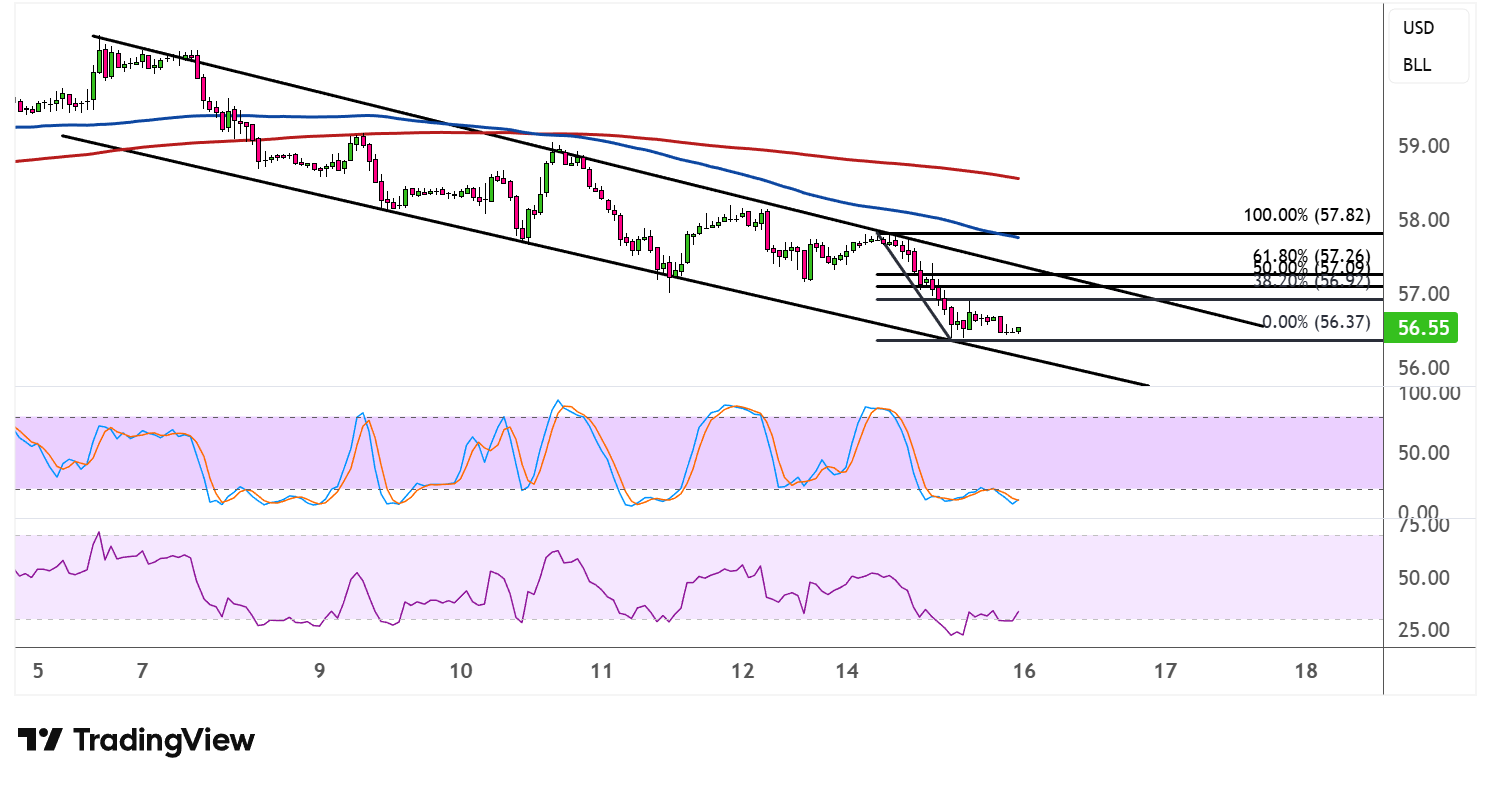 应用于近期下跌的斐波那契回撤工具显示了卖方可能等待的关键阻力位。38.2%的斐波布位于56.97美元,接近当前价格走势,可能仅提供适度阻力。50%水平位于57.28美元,而更大的调整可能达到61.8%的Fib,57.65美元。
