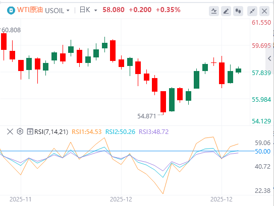 12月30日,原油在周二欧洲早盘交易时段的交易价格约为57.85美元。在乌克兰和平协议未取得突破及地缘政治风险存在的情况下,WTI价格继续推动了涨势。