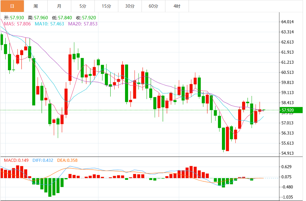 MACD指标仍处于零轴下方,绿柱虽有收敛但尚未形成金叉,暗示反弹持续性有限。整体来看,在基本面供应过剩预期未明显改善之前,WTI日线更倾向于在57—60美元区间内反复震荡,下方需重点关注57美元一线支撑,若失守,油价可能重新测试前低区域。