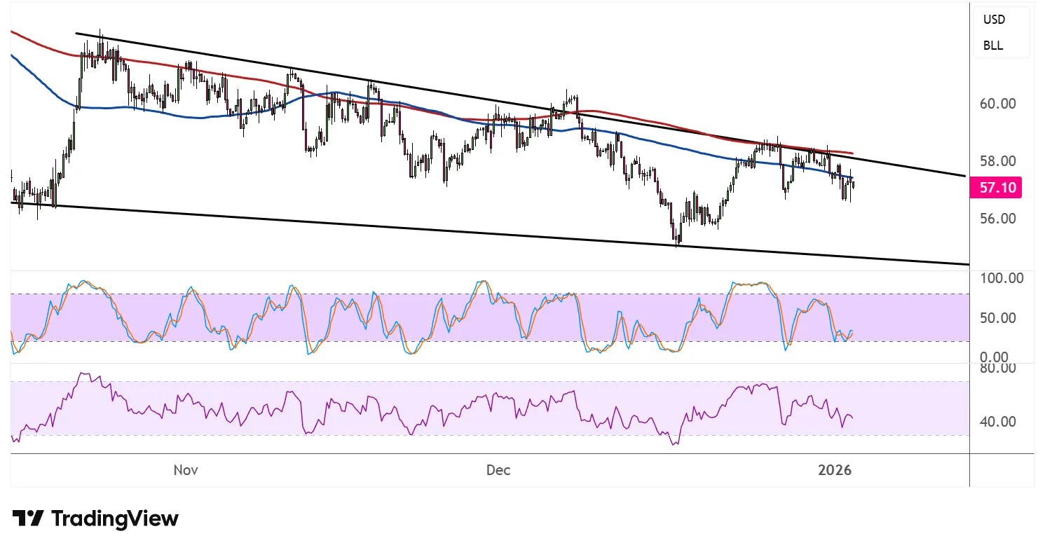 WTI原油可能会根据库存报告和地缘政治动态的表现,尽管全球需求减弱和供过于求的担忧仍拖累市场情绪。围绕美国俘获委内瑞拉总统马杜罗的事态发展也可能影响大宗商品行为,因为供应问题可能推高能源价格。