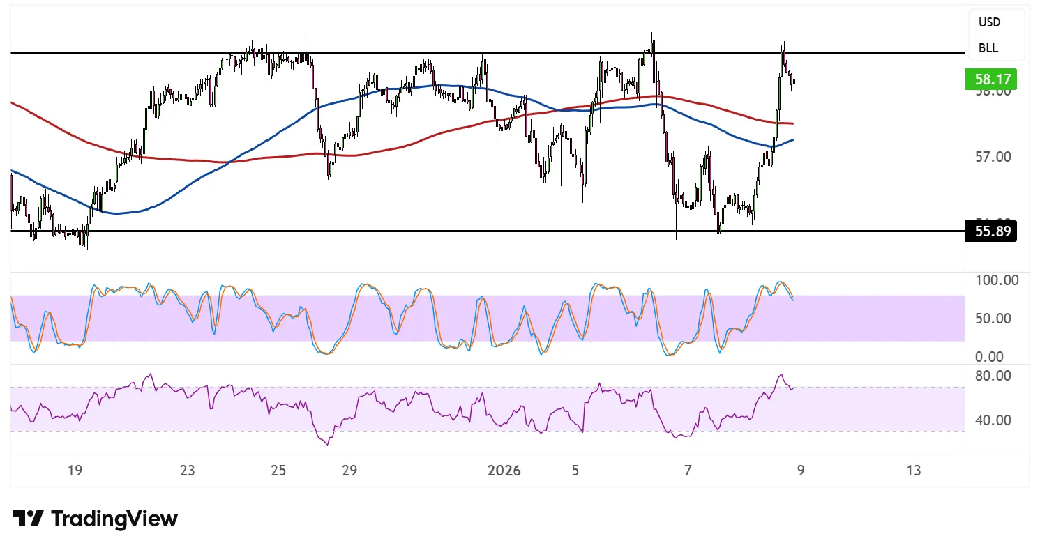 若跌破区间阻力和移动平均线,可能预示动能转变,使WTI原油攀升至下一上行目标。另一方面,若回落至当前水平,可能测试区间支撑约为每桶55.89美元,或接近55美元的低位。