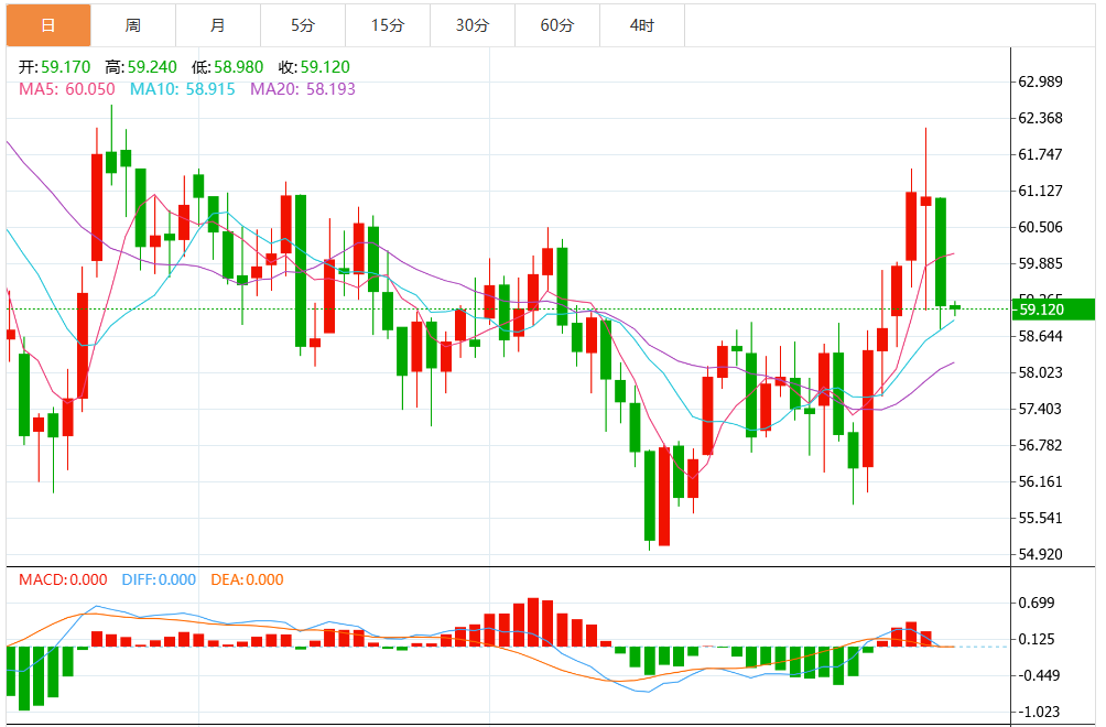 在下行方面,立即支撑位位于59.00–58.00美元区间,短期和中期移动平均线在此处交汇。 若持续跌破该区域,将加强看跌压力,并可能暴露下一个支撑区域在56.00-55.00美元附近。