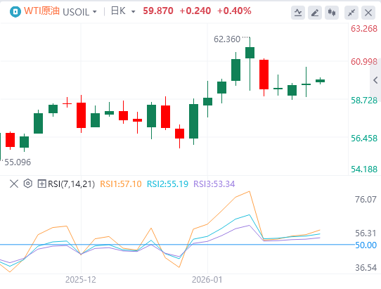 在格陵兰危机升级和哈萨克斯坦一个大型油田意外停机的情况下,WTI价格持续上涨。交易员们正等待美国石油协会(API)周二晚些时候发布的原油库存报告。截至目前,WTI原油报价59.87美元,Brent原油报价64.23美元。