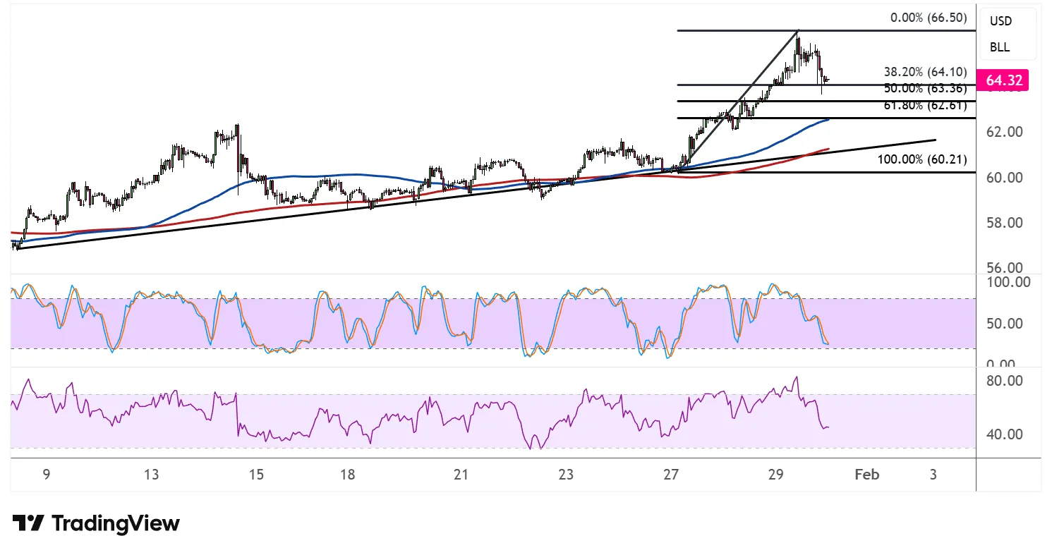 该商品目前交易约64.32美元,若调整至关键支撑区,可能吸引更多买家持续上涨。