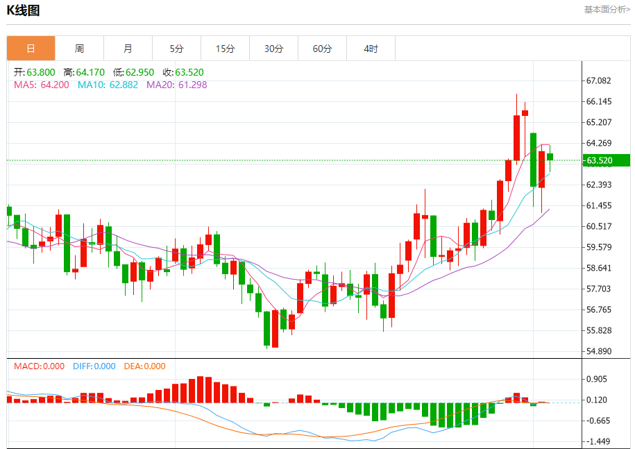 周三盘中,WTI原油报63.490,涨幅0.44%。