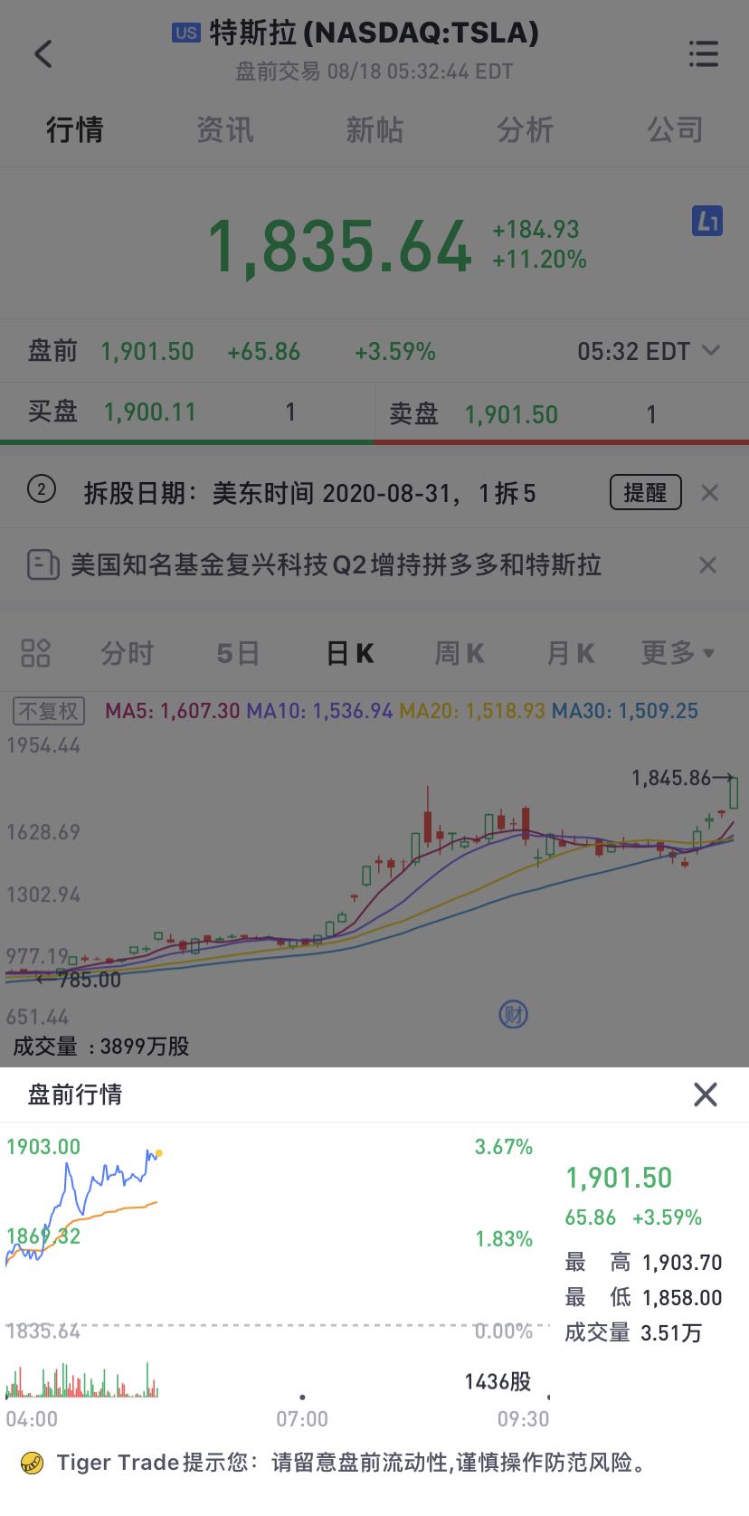8月18日,特斯拉盘前涨幅扩大至3.5%,股价站上1900美元整数关口,续刷历史新高。