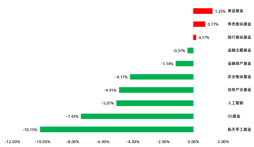 上周主题行业基金涨少跌多,各常见主题行业基金中仅黄金基金、有色板块基金和银行板块基金实现正收益。航天军工基金净值周跌幅为10.15%,收益排名垫底。今年以来,军工板块持续调整,航天军工基金年内下跌18.35%。值得一提的是,军工板块需求跟踪难度较大、定价机制不确定性较强,研究壁垒较高,投资者需要关注行业特殊性,注意仓位控制。