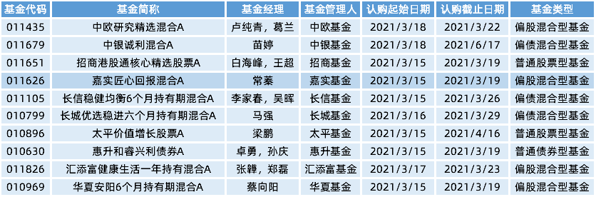 本周全市场拟新发行基金一共59只(同一基金不同份额只展示一只),发行热度较上周大幅降温。其中,偏股型基金有33只,偏债型基金有21只,指数型基金有5只。下表为近期部分新发基金。
