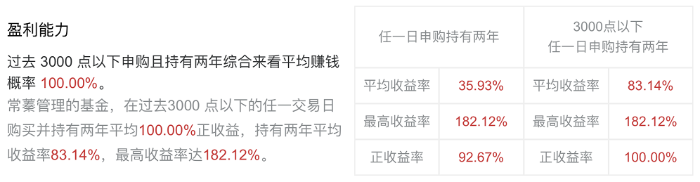 常蓁盈利能力:常蓁管理的基金,在过去3000 点以下的任一交易日购买并持有两年平均100.00%正收益,持有两年平均收益率83.14%,最高收益率达182.12%。