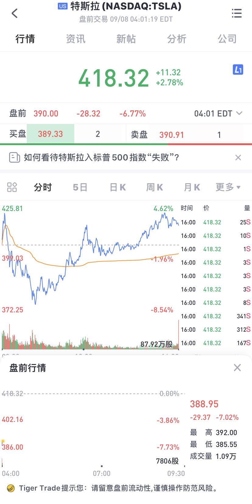 特斯拉盘前跌超7%,此前标普500指数重组并未纳入特斯拉股票。