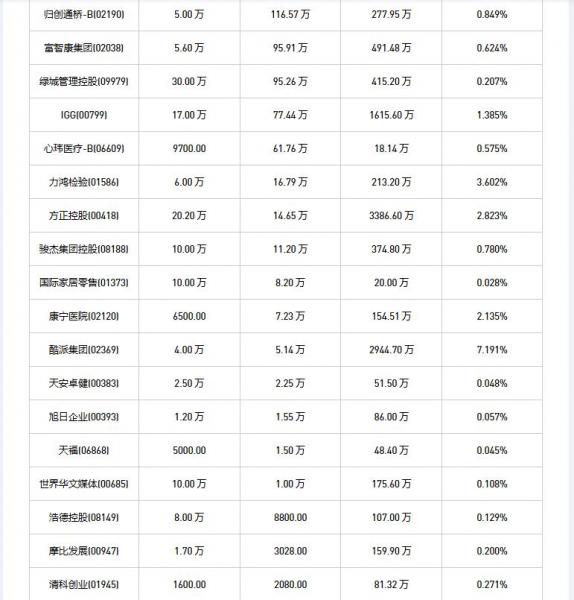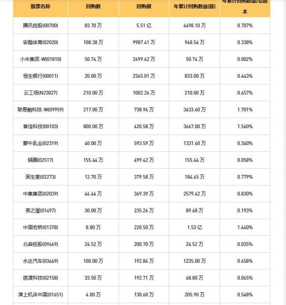 摩比发展(00947)、方正控股(00418)、津上机床中国(01651)、富智康集团(02038)、蒙牛乳业(02319)、天福(06868)、首佳科技(00103)、力鸿检验(01586)、天安卓健(00383)、清科创业(01945)、中集集团(02039)、国际家居零售(01373)、联易融科技-W(09959)、IGG(00799)、归创通桥-B(02190)、腾讯控股(00700)、固生堂(02273)、旭日企业(00393)、锅圈(02517)、世界华文媒体(00685)、恒生银行(00011)、小米集团-W(01810)、绿城管理控股(09979)、骏杰集团控股(08188)、燕之屋(01497)、心玮医疗-B(06609)、北森控股(09669)、美亨实业(01897)、浩德控股(08149)、安踏体育(02020)、酷派集团(02369)、医渡科技(02158)、永达汽车(03669)、康宁医院(02120)、云工场(N23027)、中国宏桥(01378)于2025年9月29日进行了回购。其中,回购金额最大的为腾讯控股(00700),回购数量83.70 万,回购金额5.51 亿元。