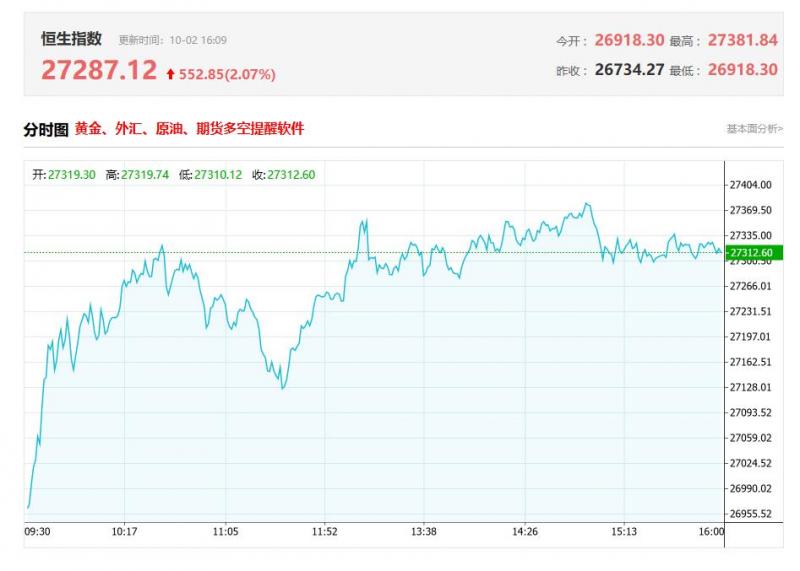 香港恒生指数10月2日(周四)收盘上涨431.56点,涨幅1.61%,报27287.12点;