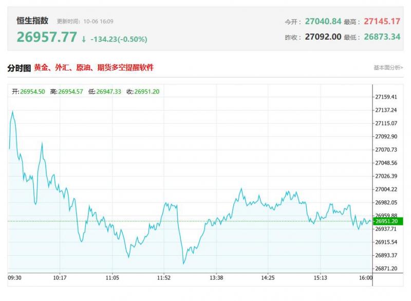 香港恒生指数10月6日(周一)收盘下跌183.15点,跌幅0.67%,报26957.77点;