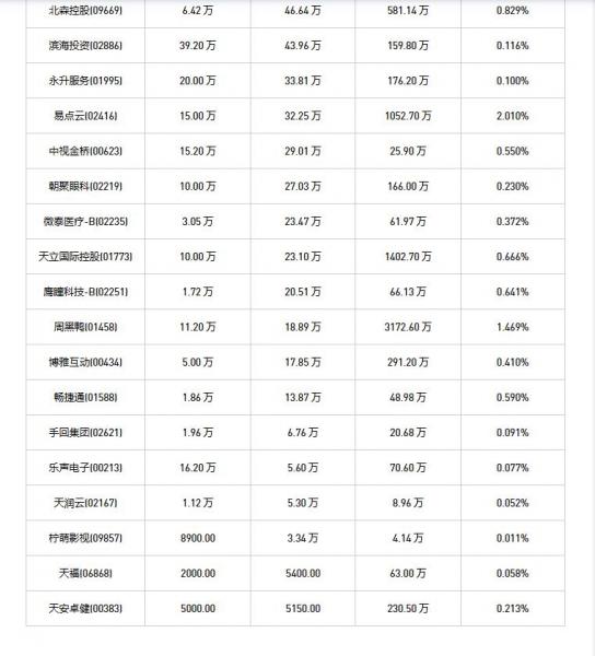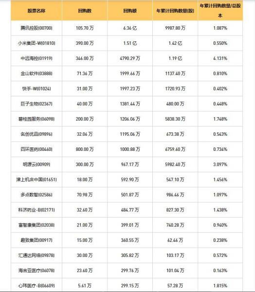 天润云(02167)、富智康集团(02038)、VITASOY INT'L(00345)、信利国际(00732)、希玛医疗(03309)、昊海生物科技(06826)、海吉亚医疗(06078)、津上机床中国(01651)、天福(06868)、碧桂园服务(06098)、绿城服务(02869)、中视金桥(00623)、天安卓健(00383)、中远海控(0)、腾讯控股(00700)、永升服务(01995)、汇通达网络(09878)、滨海投资(02886)、明源云(00909)、中远海发(02866)、名创优品(09896)、易点云(02416)、周黑鸭(01458)、乐声电子(00213)、柠萌影视(09857)、微泰医疗-B(02235)、歌礼制药-B(01672)、天伦燃气(01600)、小米集团-W(01810)、金山软件(03888)、捷利交易宝(08017)、多点数智(02586)、畅捷通(01588)、快手-W(01024)、知行科技(01274)、绿茶集团(06831)、博雅互动(00434)、枫叶教育(01317)、巨子生物(02367)、思派健康(00314)、鹰瞳科技-B(02251)、同道猎聘(06100)、心玮医疗-B(06609)、趣致集团(00917)、德康农牧(02419)、叮当健康(09886)、连连数字(02598)、北森控股(09669)、四环医药(00460)、朝聚眼科(02219)、科济药业-B(02171)、天立国际控股(01773)、荃信生物-B(02509)、锅圈(02517)、手回集团(02621)于2025年12月29日进行了回购。其中,回购金额最大的为腾讯控股(00700),回购数量105.70 万,回购金额6.36 亿元。