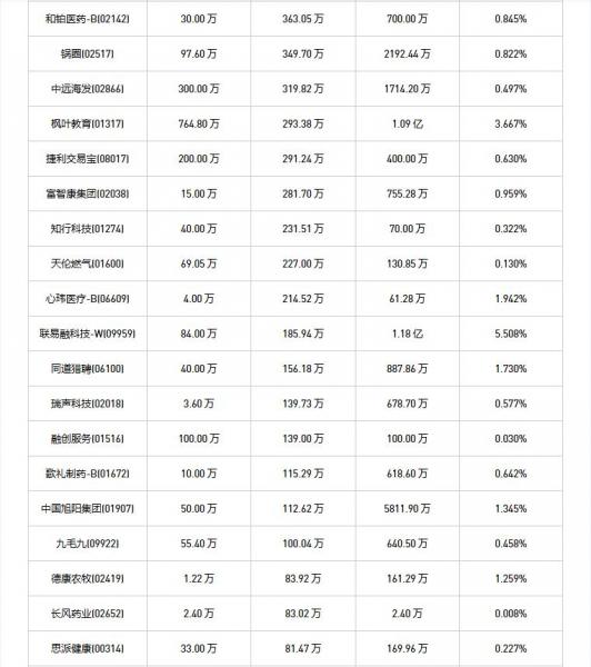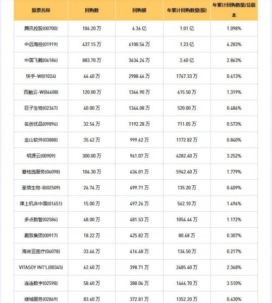 摩比发展(00947)、VITASOY INT'L(00345)、中视金桥(00623)、百宏实业(02299)、腾讯控股(00700)、健康之路(02587)、信利国际(00732)、心玮医疗-B(06609)、中远海控(0)、津上机床中国(01651)、绿城服务(02869)、明源云(00909)、联易融科技-W(09959)、天福(06868)、永升服务(01995)、滨海投资(02886)、巨子生物(02367)、碧桂园服务(06098)、歌礼制药-B(01672)、柠萌影视(09857)、天立国际控股(01773)、中国飞鹤(06186)、中远海发(02866)、知行科技(01274)、畅捷通(01588)、富智康集团(02038)、海吉亚医疗(06078)、博雅互动(00434)、汇通达网络(09878)、名创优品(09896)、易点云(02416)、周黑鸭(01458)、德康农牧(02419)、和铂医药-B(02142)、枫叶教育(01317)、天伦燃气(01600)、乐声电子(00213)、捷利交易宝(08017)、思派健康(00314)、百融云-W(06608)、趣致集团(00917)、鹰瞳科技-B(02251)、快手-W(01024)、同道猎聘(06100)、连连数字(02598)、融创服务(01516)、锅圈(02517)、中国旭阳集团(01907)、KEEP(03650)、金山软件(03888)、瑞声科技(02018)、北森控股(09669)、多点数智(02586)、涂鸦智能-W(02391)、绿茶集团(06831)、九毛九(09922)、叮当健康(09886)、同方友友(01868)、长风药业(02652)、荃信生物-B(02509)、手回集团(02621)于2025年12月30日进行了回购。其中,回购金额最大的为腾讯控股(00700),回购数量106.20 万,回购金额6.36 亿元。