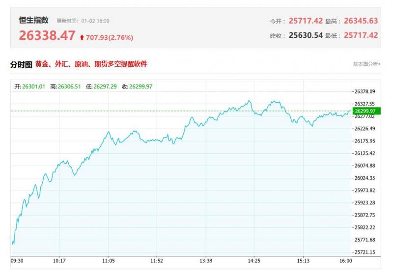 香港恒生指数1月2日(周五)收盘上涨707.93点,涨幅2.76%,报26338.47点;