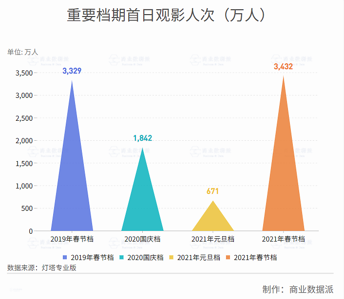 灯塔数据显示,2021年春节档首日观影人次达3432.1万人次,较疫情前2019年春节档首日3229.3万人次增长6.27%。如果将时间放长可以发现,今年春节档较2020年下半年最重要档期国庆档1842万人观影人次也有巨大提升,增长幅度高达86.32%。